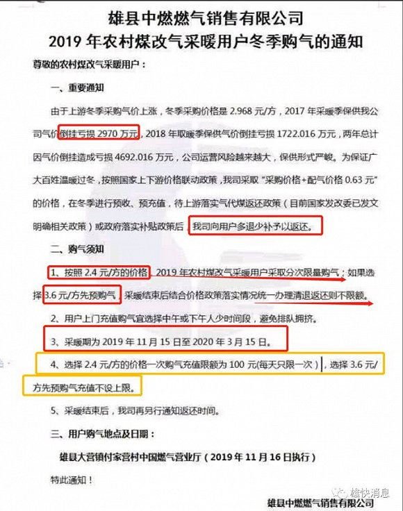 日前,一份网传的保定市雄县中燃燃气销售有限公司(下称中燃燃气)的通知称,由于上游冬季采购气价上涨,为在采暖季保供,该公司2017年和2018年分别气价倒挂亏损2970万元和1722.016万元,两年累计亏损4692.016万元,公司的运营风险越来越大。