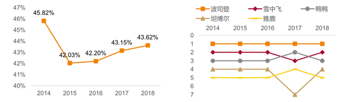 市场集中度方面,中国羽绒服市场集中度较高,并呈现出集中度持续提升的趋势。根据前瞻产业研究所公布的数据,中国羽绒服行业CR10维持在40%-50%之间,并自2015年以来集中度略微有所上升。此外,波司登在本土品牌中长期处于领先位置,这也是波司登拥有的护城河之一。