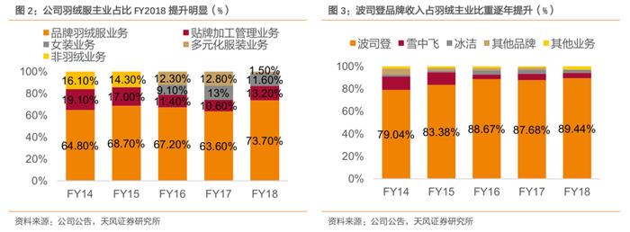 波司登近年来实现业绩反转的重要战略之一,就是重新聚焦羽绒服主业。在业务结构上,波司登品牌羽绒服业务的占比不断提升,而贴牌加工、多元化服装等业务不断收缩。聚焦主业的战略在长期来看对品牌形象的树立大有裨益,集中意志,往往可以击穿顽石。