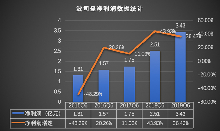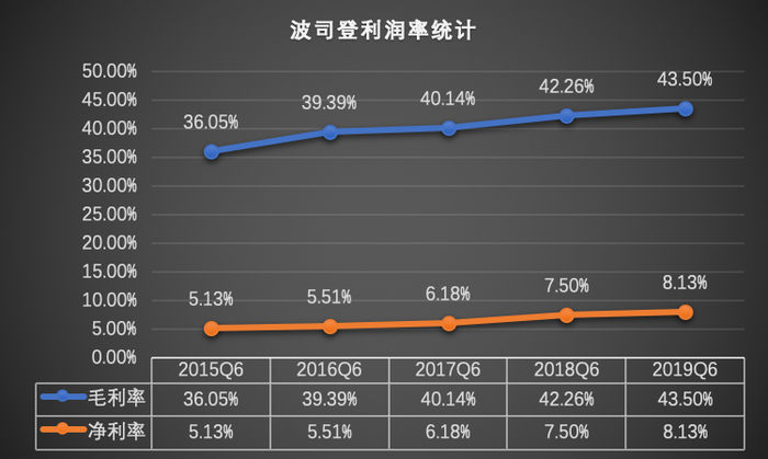 净利润总额持续攀升。期内,波司登录得期内溢利达3.43亿元,同比增长36.43%。2015-2019年期间,波司登的中期净利润年复合增长率达到27.2%,并在往年纪录中呈现加速增长的趋势。
