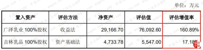 广泽乳业100%股权的交易价格7.61亿,评估增值率达161%;吉林乳品100%股权的交易价格为0.55亿。置换资产差额为3.41亿。