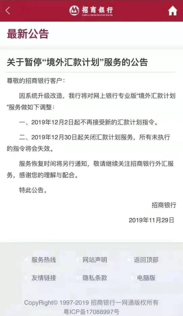 招商银行官网发布暂停“境外汇款计划”服务的公告。