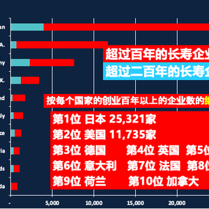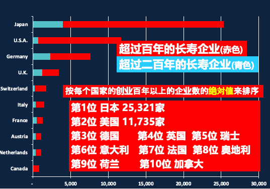 这是一个令人震惊的数字。但同时新的问题又来了,在世界范围内,有多少家企业经营超过百年了呢?随后我的研究结果表明,第一名是日本,25321家;第二名是美国,11735家;剩下的排位依次是德国、英国、瑞士、意大利、法国、奥地利、荷兰、加拿大等。