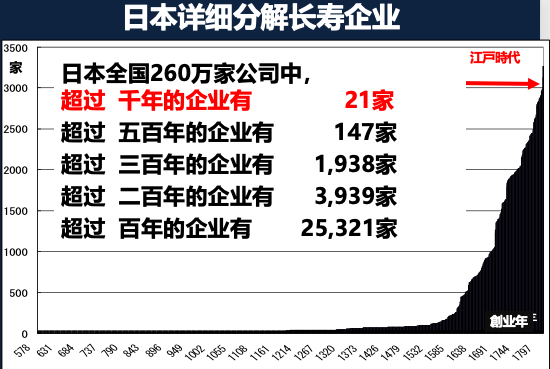 日本有260万家企业,百年企业是25321家,大约占比1%。日本企业的平均寿命是52岁,美国是24岁。日本百年企业中,持续200年以上的企业是3939家,300年以上的是1938家,500年以上的是147家,超过1000年的企业也有21家。