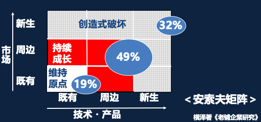 著名的管理学家安索夫提出过一个技术和产品是横轴,市场为纵轴“安索夫矩阵”理论的经营战略分析图。我借鉴安索夫理论,如下图将市场和产品都分为3部分,分析日本的百年企业的多角化战略。