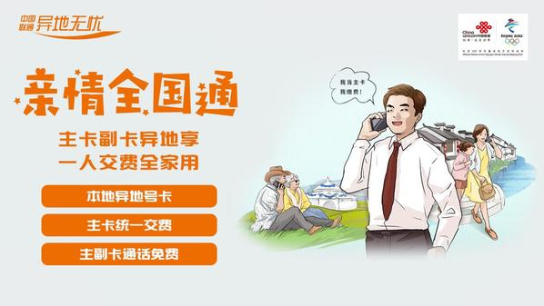 中国联通推出全新的异地交费业务,包括合帐交费(营业厅异地交费、自然人统一交费、亲密付、亲密充)、合打发票等,让每一个孝子都能在远方孝顺自己的父母,让每一颗心时刻联通。
