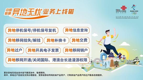 现在,中国联通全面升级“异地无忧业务”,以“服务内容更多样”、“办理流程更便捷”为标准,让消费者享受方便随心的业务体验。