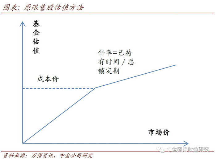 实事求是地说,即使在以前的简易算法下,虽然公式简单,但数据处理存在一定难度,投资者对于当时(比如2016年)定增基金的净值也存在一定疑虑。而现在公式更为复杂了,对投资者来说黑箱化的程度也自然更高了。在以前的模式下,限售股(比如定增得来的股份)的估值为:V= min(当前价,成本价+ (当前价 - 成本价)* 已持有的时间 / 总锁定期),或者表示如下图。