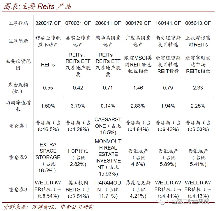 6、REITs市场方面,国内共有6支基金主要投资于REITs领域。其中,上投摩根、南方、广发的三只基金别分跟踪了3个较为主流的REITs指数;诺安、嘉实、鹏华的三只基金则为主动投资。