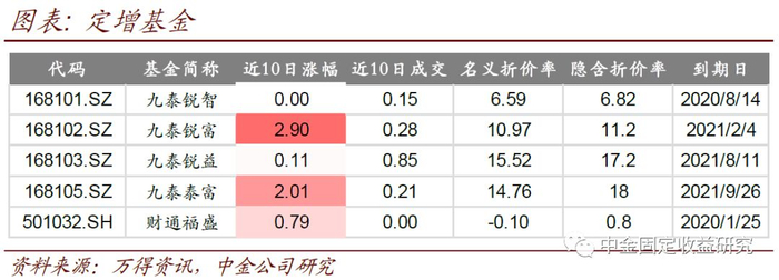 定增基金分化稍大,平均涨幅1%,其中九泰瑞富、九泰泰富涨幅超过2%。整体上,定增基金的名义、隐含折价率有小幅压缩,但并不明显。