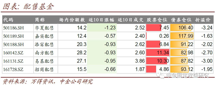 3、配售基金近10日平均下跌0.88%,与市场预期走势比较吻合。此前市场开始预期银行股的战略配售,配售基金随之上涨。不过近期市场情绪不佳,新股上市出现破发、涨幅偏低等情况,配售基金近期也出现回落。