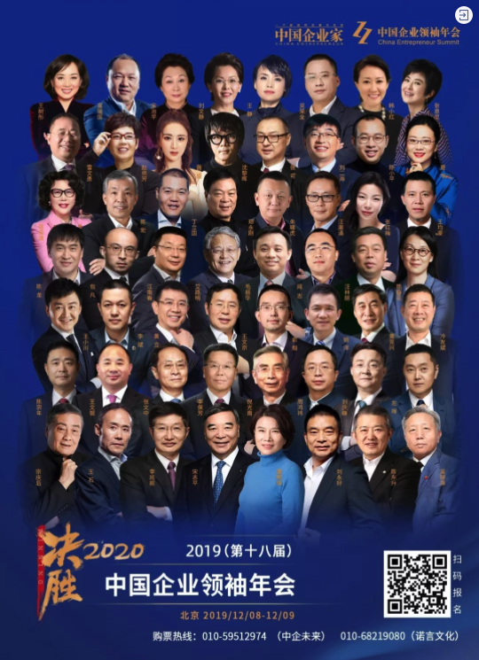 2019(第十八届)中国企业领袖年会将于12月8日至9日在北京举行,董明珠、刘永好、陈东升、王石、宗庆后、周鸿祎、宋志平、张文中、王文银、左晖等企业领袖已确认出席。年会门票火热销售中,购票热线:010-59512974(中企未来);010-68219080(诺言文化)