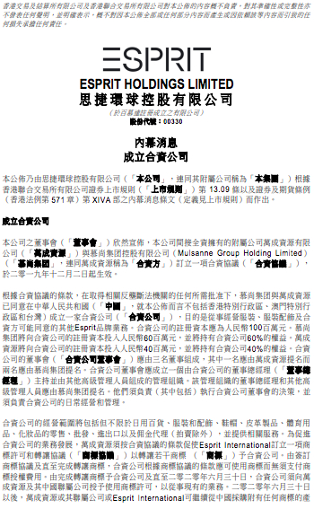 根据合资协议的条款,在取得相关反垄断法机关的任何所需批准下,慕尚集团与万成资源已同意在不包括中国香港特别行政区、中国澳门特别行政区和中国台湾的中国其他地区成立一家合资公司,目的是从事经营服装、服装配饰及合资方可能同意的其他Esprit品牌业务。