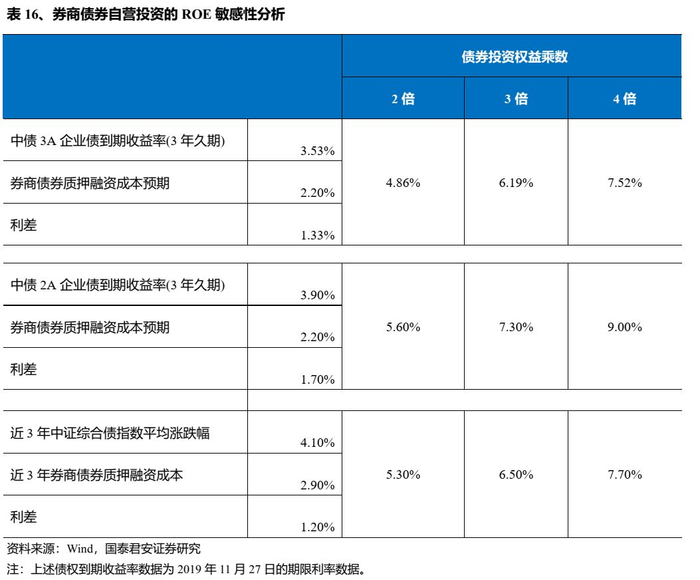 债券投资存在负利差风险,基于流动性和信用风险考量,加杠杆相对谨慎。1)债券市场收益率波动低于股市,成为券商近几年自营资产扩张的主力。拉长期限看,债市2012年至19年H1平均回报率为4.4%,券商卖出回购金融资产的平均利率为3.4%,可获得1%的利差。但债券市场收益率仍具有波动特征,在2013年、2016年和2017年收益率仍难覆盖负债成本,具有负利差风险。2)获取更高的回报率往往需要拉长债券投资久期或降低信用评级标准,基于利率风险和信用风险的考量,券商在债券投资业务上加杠杆更加谨慎,对杠杆空间受限。3)我们基于目前市场利率水平进行敏感性分析,以3A级债券3年期到期收益率3.5%估算,券商在3倍-4倍杠杆率水平下,债券投资业务的ROE分别为6.2%-7.5%,券商若想获得更高的投资回报,需要承担更高的信用风险。