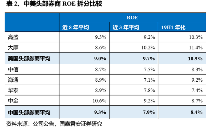 美国头部券商我们选取高盛、摩根士丹利(大摩)两家公司,中国头部券商我们选取中信、海通、华泰和中金公司4家公司,时间跨度我们选取2012年至2019年上半年这一长周期(国内券商经历了完整的一轮牛熊),通过对6家公司ROE的拆分比较,我们发现: