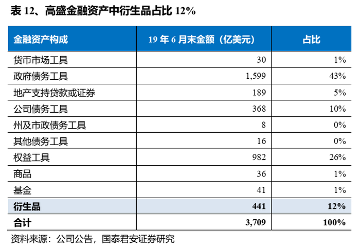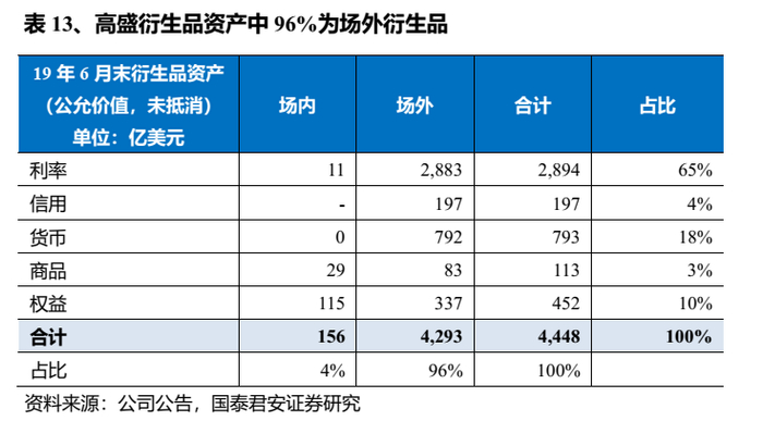 衍生品成为做市业务的重要工具,场外衍生品规模占比达96%。1)衍生品本身可以作为基础资产做市头寸的重要对冲工具,同时衍生品交易本身也需要券商提供做市服务。截止19年6月末,高盛金融资产中衍生品(抵消后)金额占比达12%。2)金融创新背景下,美国衍生品市场蓬勃发展,衍生品种类涉及利率、信用、权益、货币和商品等多种类型,同时场外衍生品规模占比达到96%。3)场外衍生品具有定制化、隐蔽性和对场内市场冲击小的诸多优点,可以满足大型机构、企业和政府客户的多元化需求,券商通过为客户创建衍生品,同时提供做市交易服务,从中赚取服务费用和佣金。