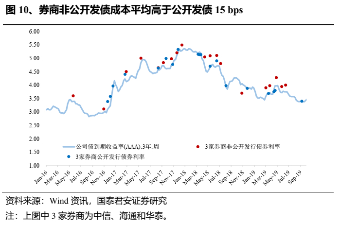 非公开发债不受40%净资产限制,成本高于公开发债。根据我国《证券法》规定,公开发行公司债,累计债券余额不得超过公司净资产的40%。超过上限后,券商只能通过非公开发行债券来加杠杆。根据我们统计,中信、海通和华泰3家券商2016年至2019年10月累计发行公司债38次,其中非公开发债19次,占比50%。券商公司债发行利率主要受当时市场利率影响,整体看,券商非公开发债较市场3年期3A公司债利率水平高22bps,公开发行债券高7bps,即非公开发债平均高于公开发债15bps。
