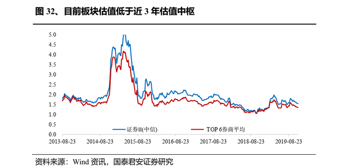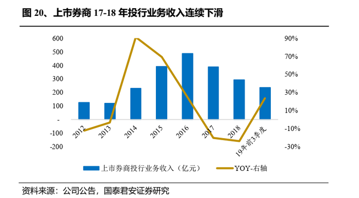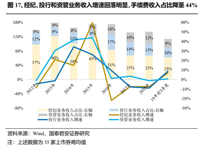 2015年后证券行业经纪、投行和资管三大业务收入增速均明显放缓,直至2019年收入增速才有改善。手续费收入占比从2013年的60%降至2019年前3季度的44%,其中经纪业务收入占比下降最为明显。