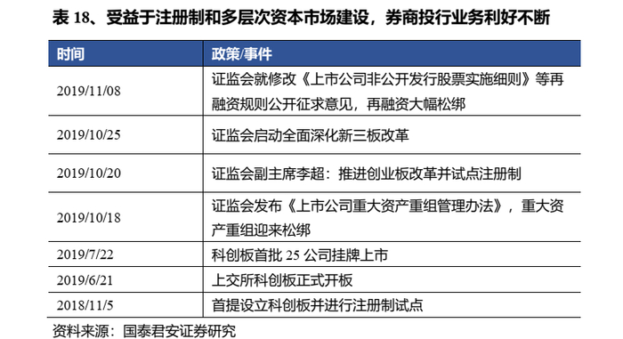 注册制改革下,科技创新型优质资产上市,为券商股权投资带来机会。截止11月22日,科创板上市公司已达56家,随着注册制和多层次资本市场市场改革的持续推进,更多的科技创新型企业有望登陆资本市场。券商在科创型企业直投方面具有先发优势,注册制和多层次资本市场改革有望带动券商直投、跟投收益持续增长,利于券商资金型业务利差扩张。