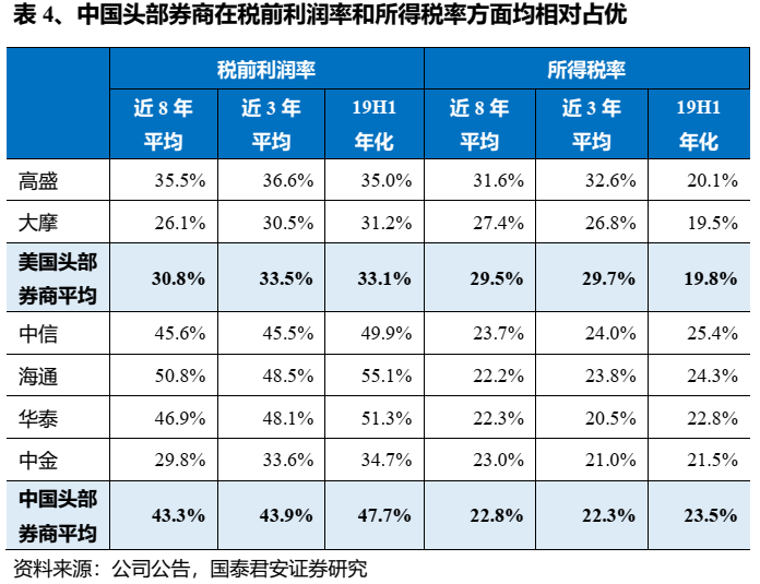 中国头部券商净利率占优,预计主要得益于人力成本和税率优势。1)美国在2018年减税前企业所得税率为35%,高于国内的25%,2018年之后(含2018年)税率降至21%,故近8年美国头部券商实际所得税率平均为29.5%,显著高于国内头部券商的22.8%。2)剥离所得税影响后,国内券商税前利润率指标依然较高,而近3年中美头部券商手续费净收入占比平均数基本持平于46%,即并非收入结构造成利润率较高,我们预计主要是国内券商管理费率相对较低,人力成本相对占优。
