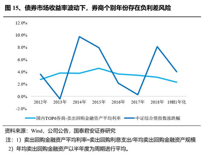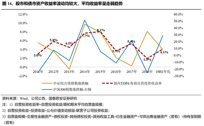 股市和债市资产收益率波动均较大,平均收益率呈走弱趋势。1)沪深300指数和中证综合债指数收益率可作为券商权益和债券资产投资回报率的参考指标,2011年至19年上半年期间,两个指数的收益率波动均较大,这使得券商自营投资加杠杆的风险极大。2)2011年至2015年,股市和债市波动同向,且趋势向上,带动券商自营投资回报率逐级抬升,TOP6券商平均自营投资收益率达到5.8%。2016年股和债的投资收益率均明显下降,而2017年至2019年上半年,股债回报率呈现反向趋势,整体看,2016年至今券商自营投资回报率呈下降趋势,TOP6券商平均自营投资收益率降至3.8%。