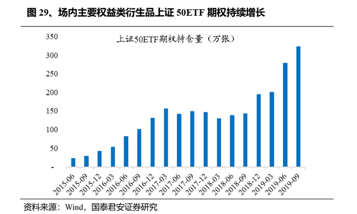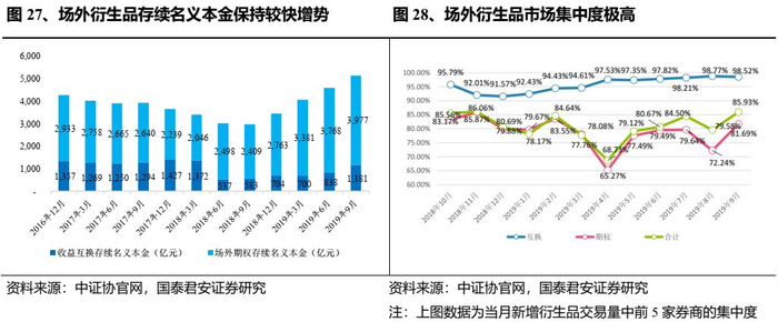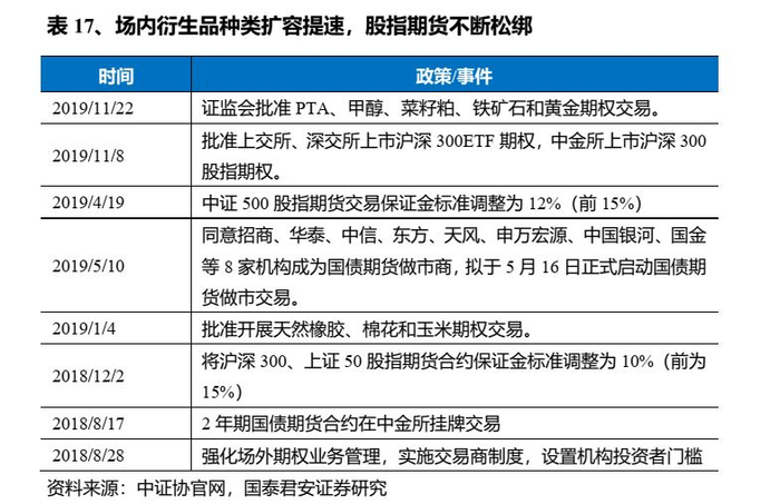 衍生品创新和机构投资者占比提升,有望带来新的牌照型业务机会。1)从美国市场经验看,场外衍生品空间巨大,券商通过产品创设和做市可获得稳定的投资回报。国内场外衍生品业务近两年呈现快速发展态势,截止19年9月末,收益互换和场外期权存续名义本金合计5158亿,近两年复合增速15%。在机构投资者占比提升和衍生品日益丰富的背景下,场外衍生品业务有望成为头部券商高收益率资产的重要增长点。2)国内场内衍生品种类仍相对匮乏,随着机构投资者需求增加、对外开放提速,国内场内衍生品迎来发展机遇期。股指期货松绑、沪深300指数和ETF期权面世以及大宗商品类衍生品日益丰富的背景下,券商场内衍生品做市业务有望持续增长。同时场内产品的丰富有助于券商降低基础资产的波动率、提升场外产品的对冲效率,利于券商资产端扩容。