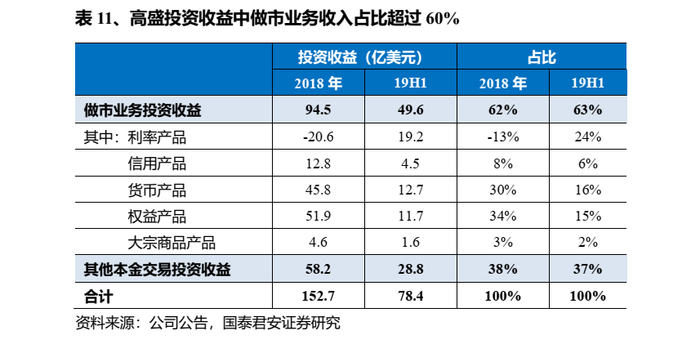 高盛投资型业务中做市类业务占比超过60%。与融资型业务相区分,我们将高盛机构客户服务分部中的做市业务和投资贷款分部中的投资业务归类为投资型业务。资产结构中,高盛做市产生的金融资产占比超过60%,该项资产的杠杆率(资产规模/公司净资产)达到2.7倍,权益投资占总投资盘规模6%。从收入贡献看,做市业务贡献的投资收益占比同样超过60%,其中FICC收益贡献更高,权益类产品做市投资收益占比在2018年和19H1分别为34%和15%。