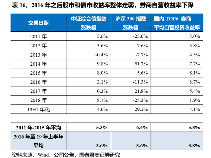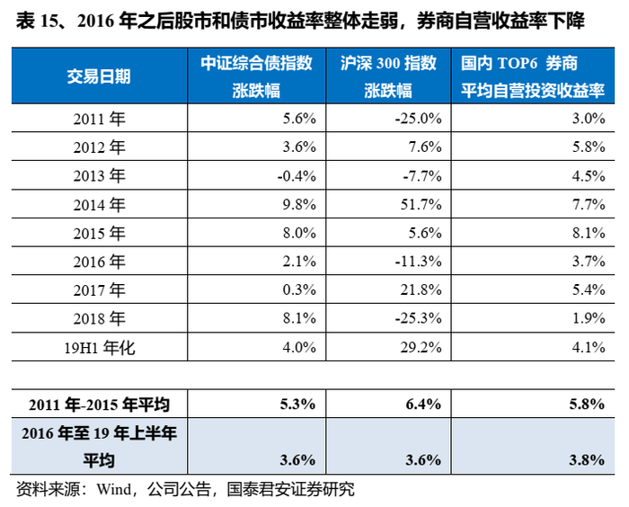 2016年后股市和债市的投资回报率整体呈下降趋势,券商自营收益率回落。2016年股和债的投资收益率均明显下降,而2017年至2019年上半年,股、债回报率呈现反向趋势,整体看,2016年至19H1券商自营投资回报率平均为3.8%,较2011-2015年平均自营投资收益率的5.8%下降2个百分点。