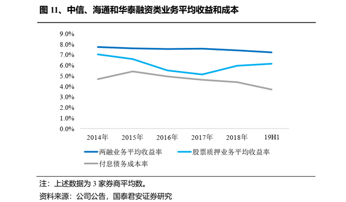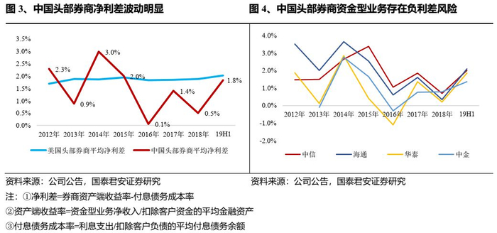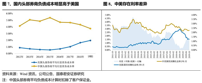 国内头部券商负债成本显著高于美国头部券商。由于国内券商实施“第三方存管制度”,无法自由支配客户资金,故我们计算国内券商平均负债成本时扣除客户保证金。以2019年上半年数据看,国内4家头部券商平均负债成本为3.76%,较美国2家头部券商平均负债成本的1.97%高出1.8个百分点。即使考虑中美利差(近1年中国3年期国债收益率平均高出美国0.5%个百分点),国内头部券商负债成本仍显著高于美国券商。