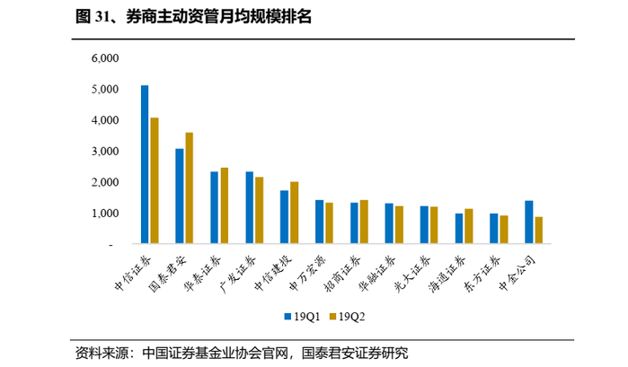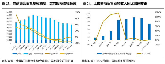 资管新规等政策影响下,券商资管规模承压明显,2019年集合资管规模增速转正。证券行业先于资管新规落地,在2017年开始主动压降通道业务规模,同时开启大集合业务整合;2018年股票质押业务压降和定增业务需求降低也较大程度上限制了券商资管业务发展,证券行业17-18年集合和定向资管规模持续下降。上市券商资管业务19Q2末券商集合资管规模1.93万亿,同比-0.1%,呈现触底趋势,在券商大集合成功转型公募产品和财富管理转型加速的推动下,预计后续券商集合资管规模有望逐步回升。