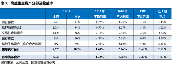 美国头部券商依靠商业银行业务可获得较高的利差型收入,抵押融资类业务主要为满足机构客户业务需求。1)08年金融危机之后,美国头部券商高杠杆和方向性自营业务不断收减,并申请商业银行牌照,依靠商业银行业务获取稳定的资产和负债。高盛资产结构中,银行贷款占比达到10%,19H1资产端收益率达到6%,该项业务平均利差达到3.7%。2)美国证券抵押融资市场相对成熟,资产端中抵押融资类业务规模占比10%,资产杠杆率高于国内券商,而该项资产整体生息收益率较低,近3年平均为1.22%,低于综合负债成本。我们认为,该项资产的形成主要是与机构业务需求有关,生息的同时可带来投资收益。例如抵押融资类资产中的“证券借入”(Securities borrowed)主要为公司借入证券(融券)所形成的保证金资产,本身生息收益率较低,但可增加公司券源,为其他客户提供融券服务或自身构建空头头寸使用。