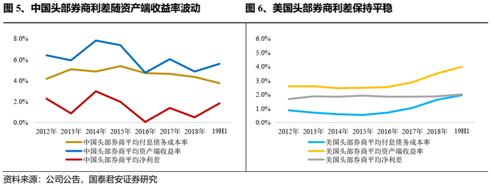 净利差趋势主要受资产端收益率影响,国内券商资产端收益率波动明显。从下图可以看出,无论是中国券商和美国券商,付息债务成本率波动均相对较小,净利差趋势主要受资产端收益率趋势影响。中国头部券商资产端收益率波动明显,波动区间在4.8%-7.8%,均值在6.1%;美国头部券商资产端收益率相对平稳,生息趋势下收益率从2016年的2.5%升至2019年上半年的4.0%,均值在2.9%。从过往8年数据看,中国头部券商平均资产端收益率显著高于美国,但波动明显,具有较强的不确定性。