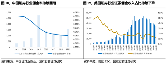 佣金率持续回落下经纪业务弹性降低,财富管理转型处于初级阶段。1)行业竞争加剧下,通道型牌照红利结束。2018年股基总成交额是2013年的2倍,而2018年行业佣金率降至0.0312%,仅为2013年佣金率的40%,使得行业佣金收入弹性大幅下降,19年前3季度上市券商佣金收入占比降至23%。2)美国佣金自由化后,美国证券行业佣金收入占比持续下降,从1973年的53.6%降至2016年的12.3%。美国佣金率持续下行环境下,证券公司通过财富管理转型实现利息净收入和资产管理收入的增长,弥补了佣金收入的下滑。3)国内券商财富管理的收入模式主要以股票投顾提供附加服务以提高佣金和代销金融产品为主,受客户偏好和代客理财模式的限制,财富管理转型仍处于初级阶段。