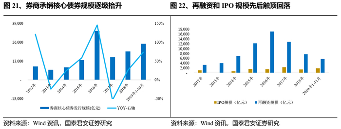 监管趋严叠加市场回落,投行业务收入连降两年,收入占比有所回落。1)上市券商投行业务收入在2016年达到峰值之后,连续两年回落,直至2019年才开始回升。收入占比从16年的17%降至19年前3季度的10%。2)我国券商核心承销债券规模(公司债+企业债+可转债)整体呈现稳健增长态势,2017年受债市回落影响同比回落明显。3)IPO规模在2017年达到峰值,2018年受股市影响发行规模明显下降,2019年改善明显。而再融资规模主要受2017年定增新规和减持新规影响,规模持续回落。