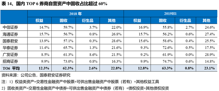 国内头部券商投资类业务以自营业务为主,衍生品占比较低。国内头部券商投资类业务以自营投资为主,债券做市类业务利润较薄,场外衍生品处于发展初期。从资产配置看,债券为主的固收类资产占比超过60%,权益占比12%-13%,衍生品占比不足3%。