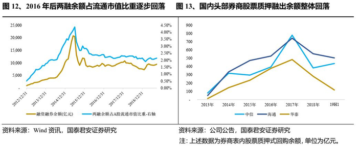 两融和股票质押业务可获得稳定利差,但国内市场空间相对受限。1)两融和股票质押业务是国内券商的两大主要融资型业务,风险可控前提下,依靠券商牌照优势,可将相对较高的融资成本转嫁到资产端(客户端),从而获得相对稳定的利差收益。两融和股票质押业务近6年平均利差分别为2.9%/1.4%。2)与美国市场相比,中国证券公司两融业务初始保证金比率为100%,低于美国的50%,同时融券券源相对匮乏,使得两融业务规模相对受限,2016年后基本维持在万亿水平。3)目前国内股票质押以大股东质押融资为主,业务本身更类似于贷款融资,券商在风控手段和股票处置方面相对薄弱,随着信用风险的增加,头部券商股票质押规模逐步回落,未来增长空间整体有限。