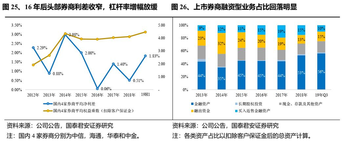融资型业务进入增长瓶颈,占比回落明显。两融规模在2016年后基本维持在万亿水平,股权质押业务在2018年开始逐步压降,券商融资型业务增长进入瓶颈期,稳定高利差的融资型业务规模占券商资产(扣除客户资金)比重从2017年末的38%降至19Q3末的25%。