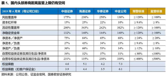 国内头部券商距离监管上限仍有空间。限制券商杠杆率的风控指标主要是风险覆盖率(净资本/各项风险资本准备之和)和资本杠杆率(核心净资本/表内外资产总额)这两个指标,以2019年中报数据看,国内4家头部券商中仅中金公司资本杠杆率指标接近监管的预警线,中信、海通和华泰证券距离预警线仍有较大空间。4家头部券商的净稳定资金率(可用稳定资金/所需稳定资金)指标距离监管预警线相对较近,券商可以通过增加1年期以上的负债来提高可用稳定资金,即加杠杆不会对该指标造成明显压力。