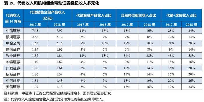 经纪收入多元化转型。面对佣金率下行趋势,财富管理转型是近几年券商发力的重点,目前主要盈利模式主要以产品代销和佣金差异化为“卖方”模式为主。2018年中信、中金和兴业证券金融产品代销收入占证券经纪净收入比重分别达到18%/10%/15%,若再考虑机构佣金部分,三家公司证券经纪收入结构多元化特征明显。