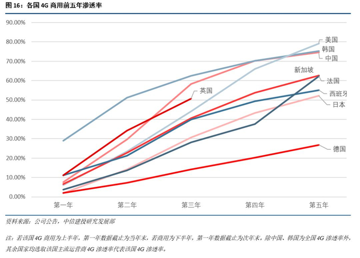 从第一年渗透率来看,除韩国外,商用较早的国家第一年4G渗透率相对较低,而商用较晚的国家4G渗透率更高,平均来看第一年渗透率约为5%。德、美、日均于2010年12月开启4G商用,但前期渗透率不高,截至2011年底(德国截至2012年底),德、美、日的4G渗透率为1.97%、6.10%、1.90%,韩国虽商用稍晚于上述国家,但商用第一年渗透率却高达28.98%(商用次年末数据)。中、法、英、西等国于2013年开启4G商用,商用后第一年渗透率分别为7.56%(次年末)、7.42%(次年中)、11.10%(次年末)、11.20%(次年末),渗透率普遍高于第批4G商用国家。