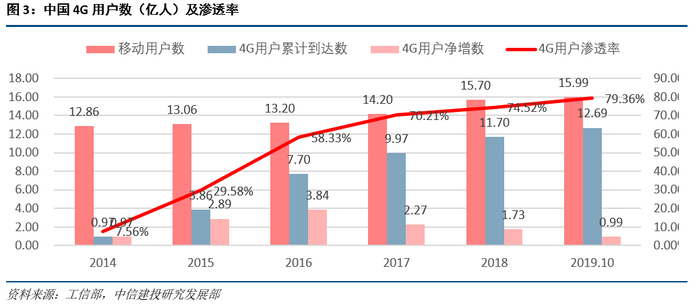 我国4G商用一年后渗透率达到7.56%,目前为79.36%。2013年12月4日,工信部向中国移动、中国电信、中国联通发放TD-LTE牌照,标志着我国正式进入4G时代。发牌后第一年我国4G用户数净增9700万,渗透率达7.56%。随后三年,我国4G用户数快速增长,2014-2017年我国4G用户净增数分别为2.89亿、3.84亿、2.27亿,渗透率达29.58%、58.33%、70.21%。截至2019年10月,我国4G用户数12.69亿,渗透率达79.36%。