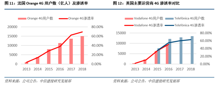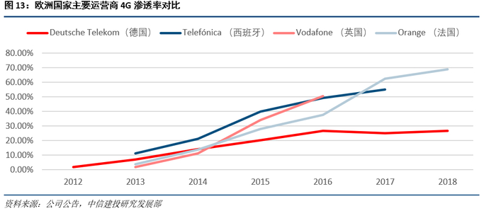 法国:Orange于2013年4月在法国提供4G商用服务,当年年底渗透率达到3.7%,2014年底达到13.7%,2018年底达69.04%。