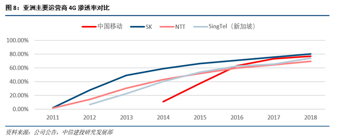 中国移动4G渗透率超过日本NTT,与韩国SK差距逐步缩小。中国移动的4G商用虽晚于日本NTT与韩国SK,但是2014-2016年中国移动4G发展迅速,2016年中国移动4G渗透率达63.03%,超过日本NTT 2.93pct,低于韩国SK 8.20pct,2018年底,中国移动4G渗透率与韩国SK差距进一步缩小至3.30pct。