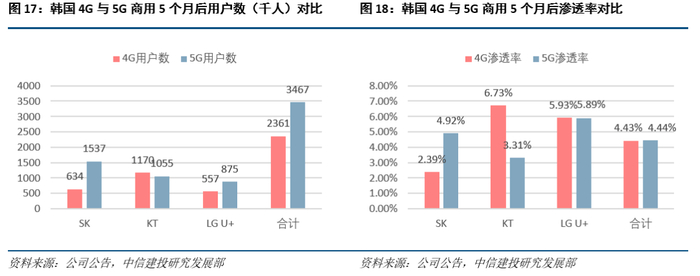 中国之外,我们认为5G用户渗透率最高的国家可能将是韩国,其余国家和地区预计初期都不会太高。