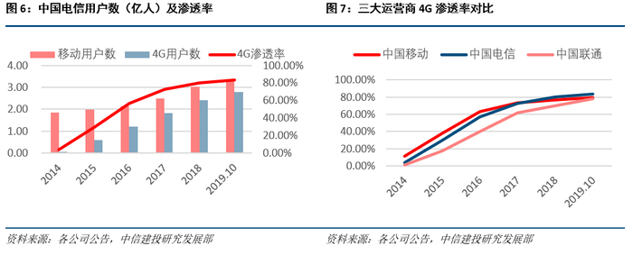 受益于TD-TLE率先发牌,4G初期中国移动的4G渗透率全面领先中国电信和中国联通。2014年,中国移动4G用户数净增9000万,渗透率达11.16%,而中国电信、中国联通当年仅新增700万、200万,渗透率为3.81%、0.79%。2013年工信部首先颁发TD-LTE牌照,移动在TD-LTE上布局领先,2012年8月就启动了大规模试验网建设,在投入规模、技术标准等方面确立了领先优势。中国联通、中国电信更倾向的FDD-LTE于2015年2月才获得工信部发牌,此时在4G竞争中已经落后于中国移动。2015年底,中国移动4G用户数已经达到3.12亿,渗透率为37.80%,中国电信、中国联通的4G用户数为5800万、4400万,渗透率分别为29.54%、17.50%。随着国内FDD-LTE技术的成熟,中国电信与中国联通也迎来4G的快速发展。截至2019年10月,中国移动、中国电信、中国联通的4G用户数为7.49亿、2.78亿、2.52亿,渗透率分别为79.38%、83.62%、78.26%。
