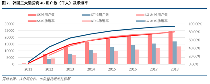 韩国4G渗透迅速,2018年底三大运营商渗透率均超80%。韩国4G商用为2011年7月,虽较日本运营商晚半年,但是4G普及极快,用户体量最小的LG U+在商用的次年4G渗透率便达到了43.10%,截至2014年底LG U+渗透率达到75.30%。SK与KT 4G渗透速度虽稍逊于LG U+,但2012-2014年4G用户数亦快速增长,2014年底SK与KT的4G用户数分别为1674万、1078万,渗透率达59.20%、59.70%。截至2018年底,SK、KT、LG U+的4G用户数分别为2480万、1697万、1413万,4G渗透率达80.30%、80.30%、94.40%。