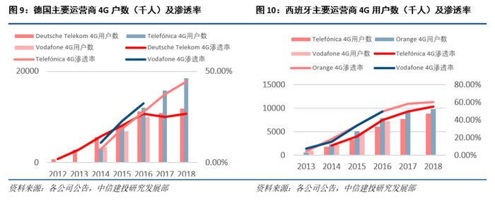 西班牙:Telefónica、Vodafone、Orange均于2013年年中在西班牙开启4G商用,截至2014年末4G渗透率分别达到11.2%、14.9%、18.2%。商用后三年内,西班牙4G用户数快速增长,2016年底Telefónica、Vodafone、Orange 4G用户数分别为607万、720万、790万,渗透率分别达39.90%、49.58%、49.63%,2018年底Telefónica、Orange 4G渗透率提升至55.10%、60.55%。