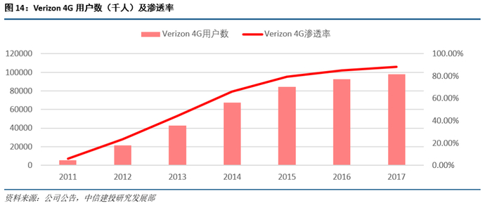 受益于移动端应用爆发,2012-2014年Verizon 4G用户快速增长。Verizon于2010年12月在美东北部为主的38个城市开始正式商用FDD-LTE网络,商用第一年4G用户数净增530万,渗透率为6.10%,2012-2014年4G用户净增数分别为1630万、2110万、2470万,渗透率分别达到23.34%、44.13%、66.03%。4G的快速渗透源于以苹果iPhone 4S为代表的智能终端的普及,刺激了众多移动应用的蓬勃发展,包括Facebook、Youtube在内的主流应用活跃用户由桌面端向移动端迁移。据Ovum预测,2019年美国的4G渗透率将会超过90%。
