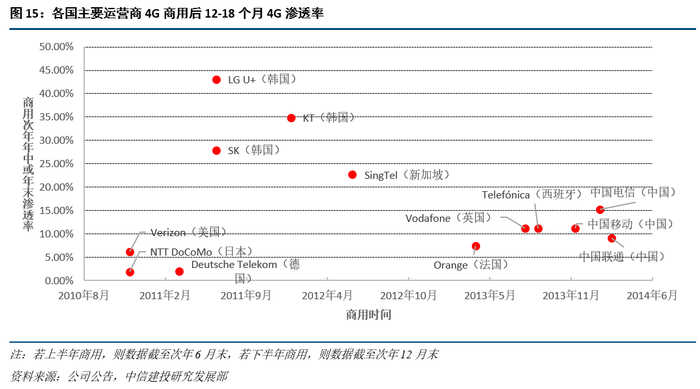 从4G商用第一年渗透率来看,各国4G商用后一年渗透率约5%左右,商用较早的国家第一年4G渗透率相对较低(1.9%-6.1%),而商用较晚的国家4G渗透率更高(7.4%-11.2%),从渗透速度来看,商用较晚的国家达到一定的渗透率所需时间更短。