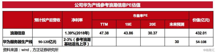 参考浪潮信息2019预测PE43.86倍,2020预测PE为30倍,我们参考浪潮信息选取参考PE30倍,预测公司华为产线价值54-108亿元人民币。